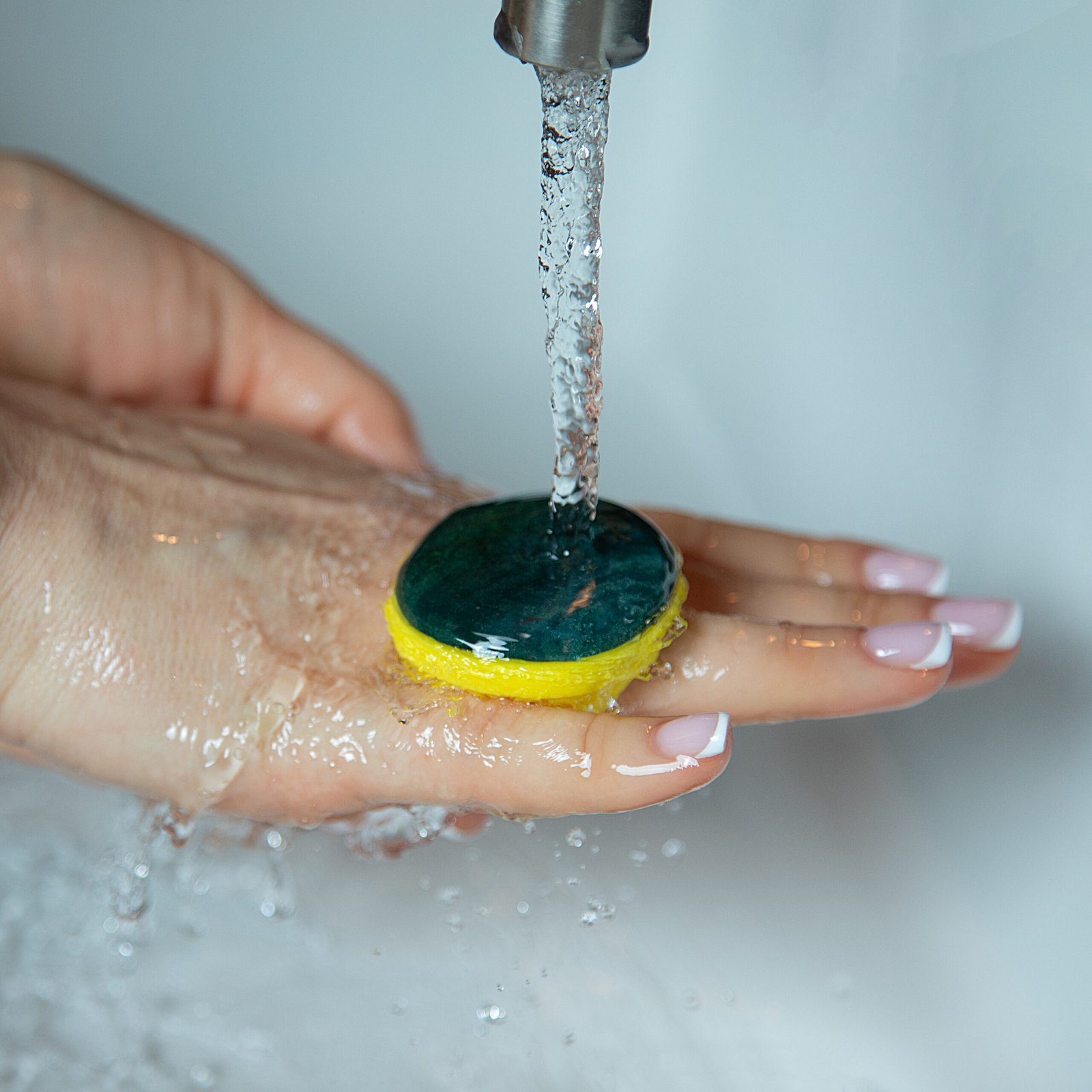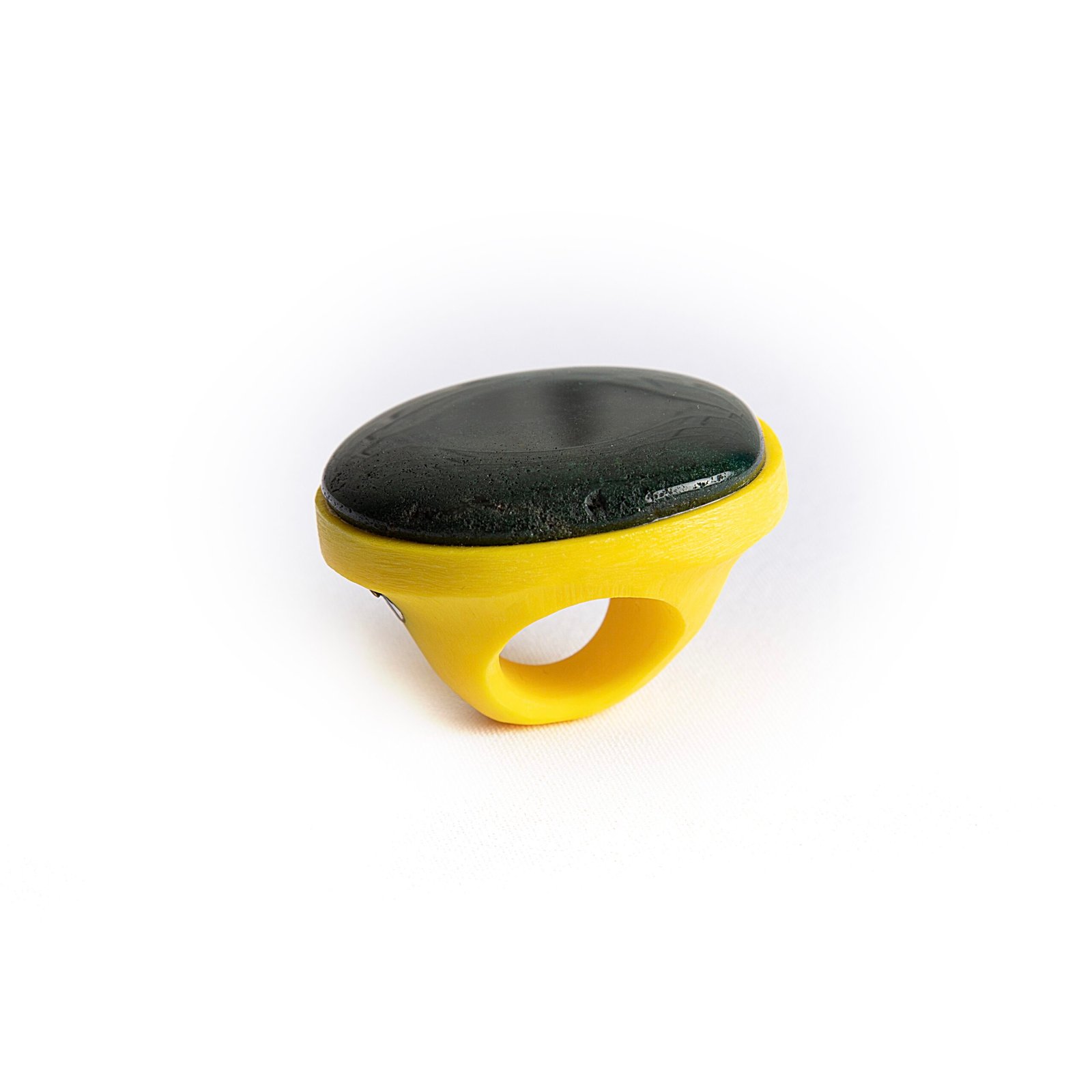 This ring features a striking contrast between a lemon yellow ceramic base and a deep green Heliotrope (Bloodstone) gemstone, creating a fresh and modern visual balance. The large round flat stone (4.5 cm) becomes the focal point of the piece, drawing attention with its rich, natural tones.