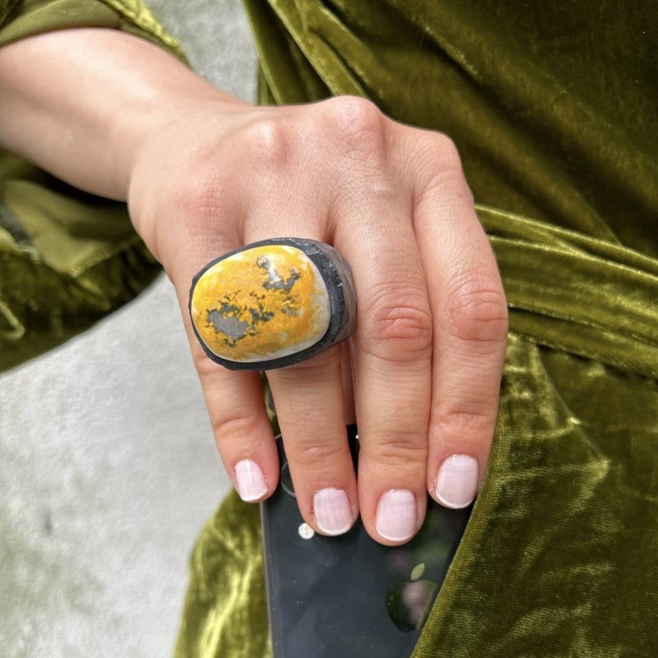 This one-of-a-kind statement ring features a striking natural Bumblebee Jasper gemstone set in a sleek black ceramic band. With its vivid mix of orange, white, and deep grey patterns, the stone creates an earthy yet vibrant contrast that draws every eye.