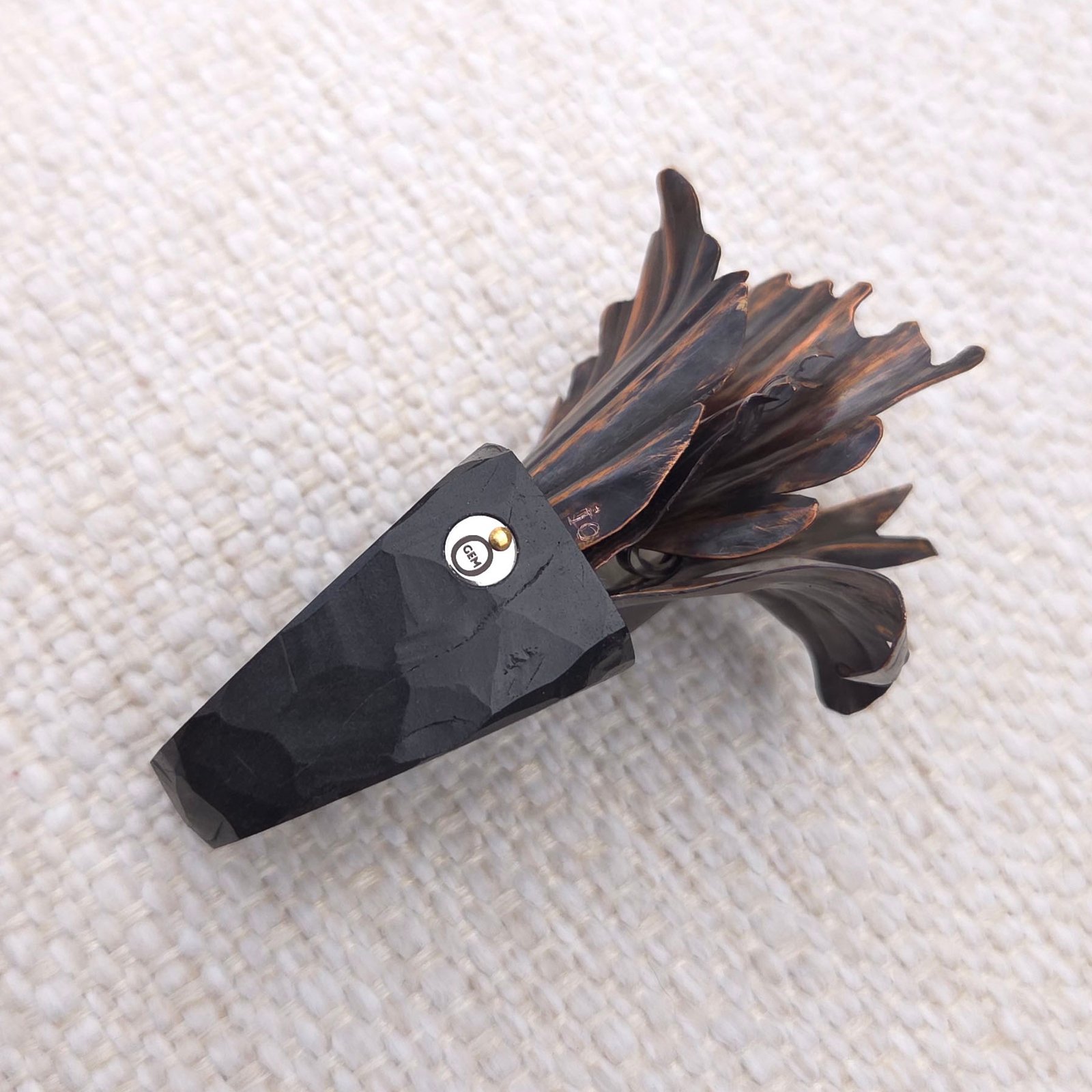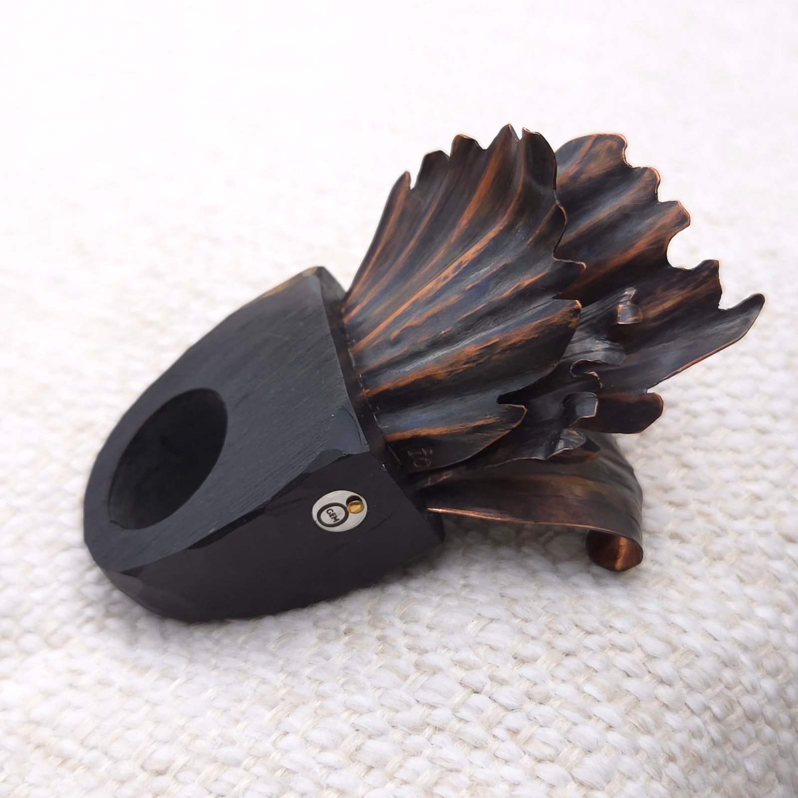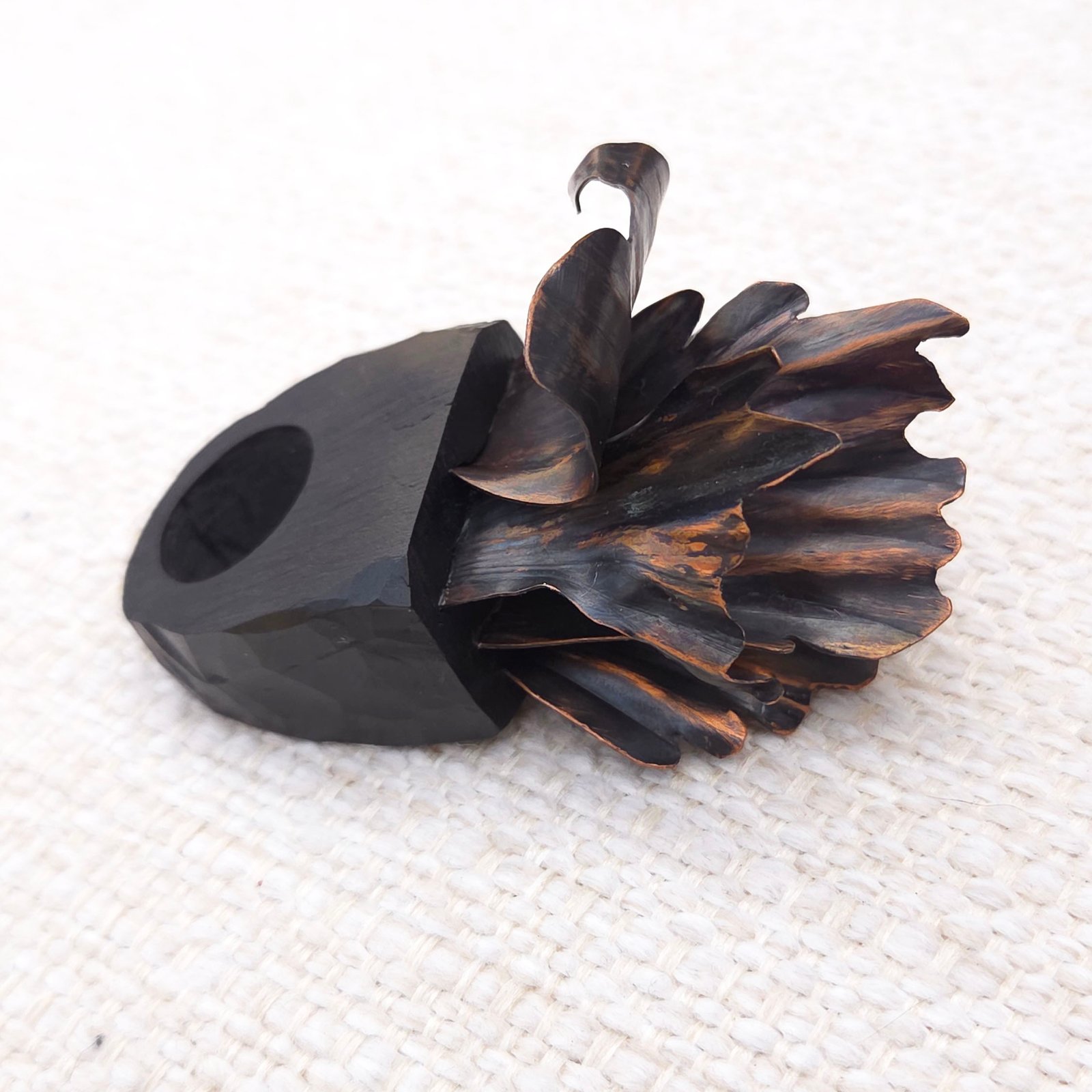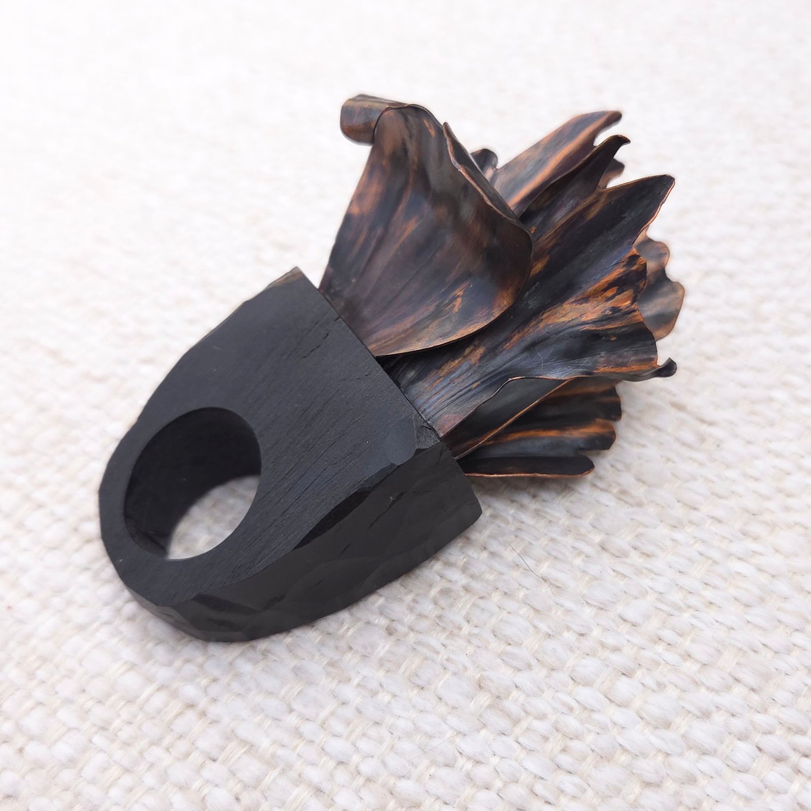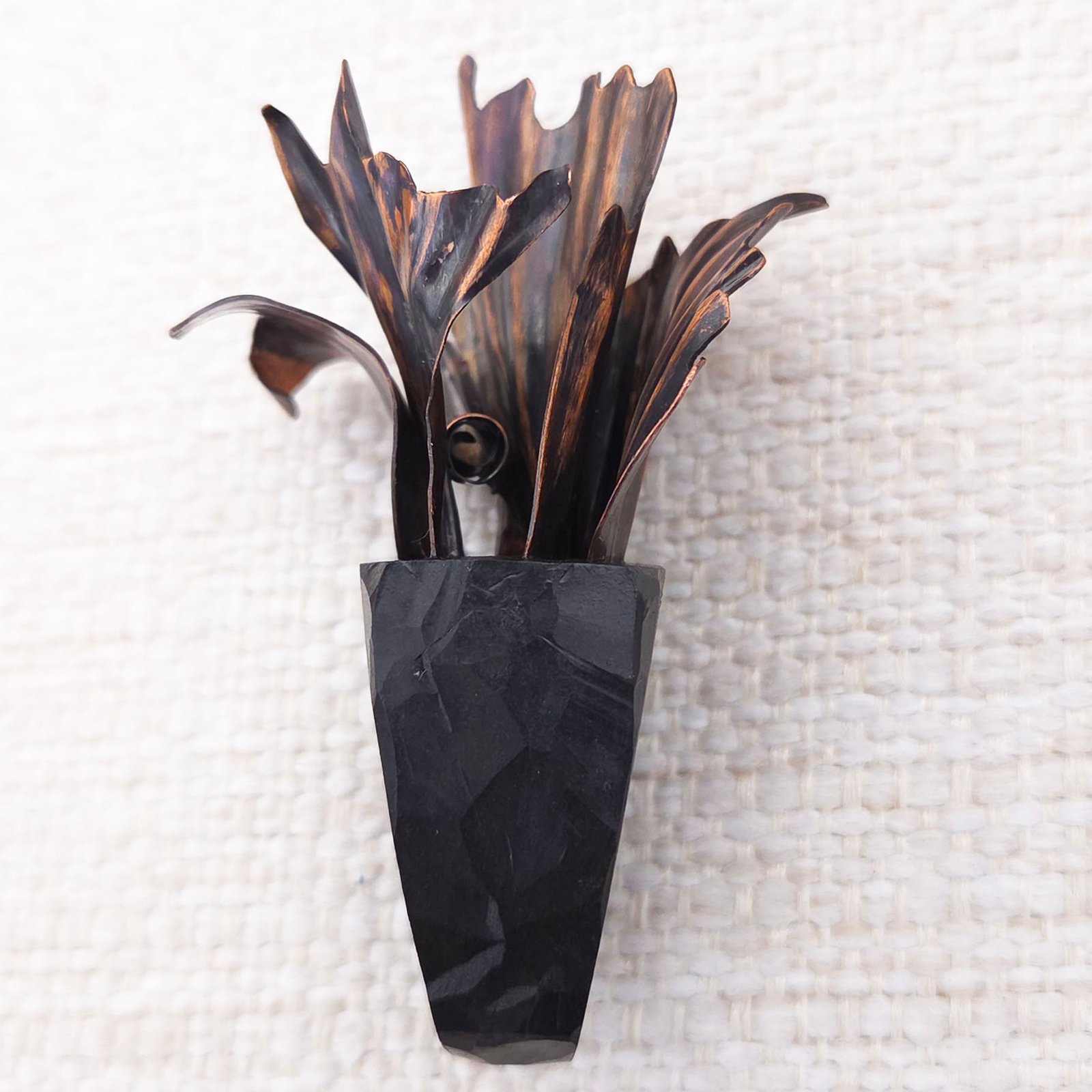The central element features metal structures shaped like the petals of a lush, blooming flower. Crafted from copper using hand-embossed and hand-chiselled technique with further oxidation, sanding and wax coating, creating a voluminous, almost living composition.