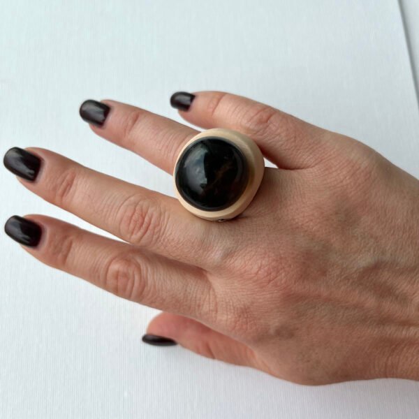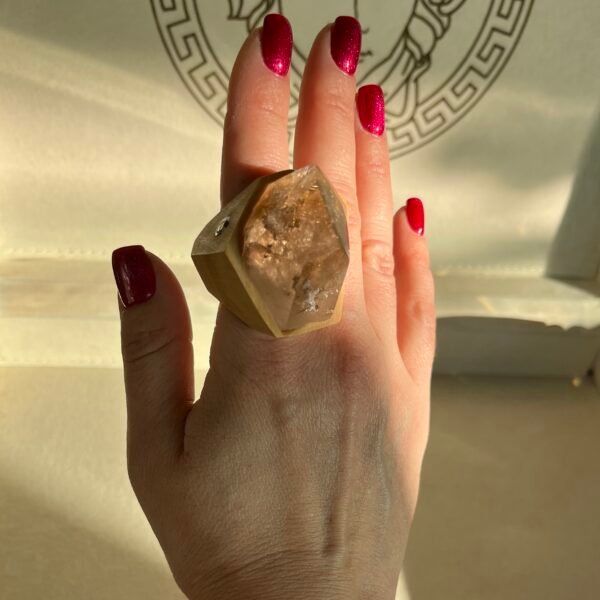 Large geometric rutilated quartz crystal is the centrepiece. Almost transparent, it holds delicate golden rutile threads inside — fine, luminous lines that seem to connect light with matter. Rutilated quartz is known as a stone of clarity and intention. It is believed to amplify emotions already present, gently strengthening love, honesty, and inner alignment rather than creating illusion.