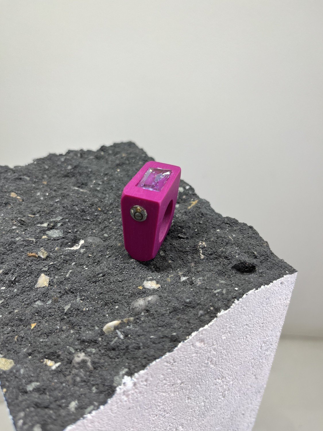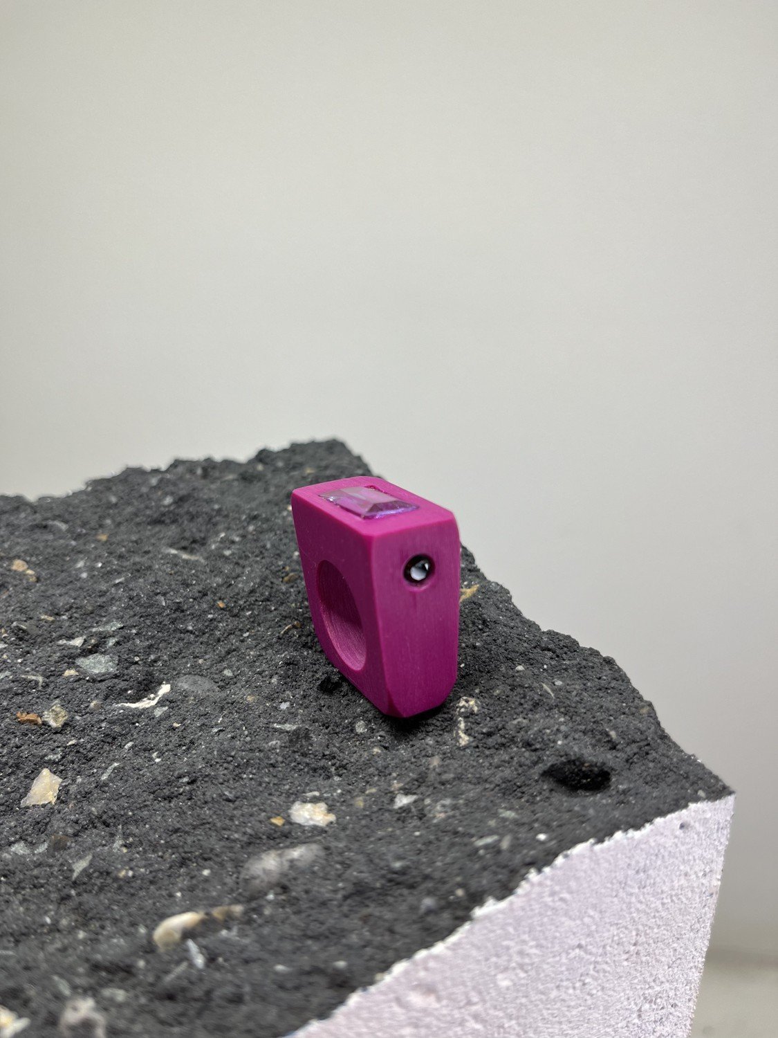 Contemporary art ring with upcycled vintage Alexandrite and Garnet gemstones, set in ceramic band.