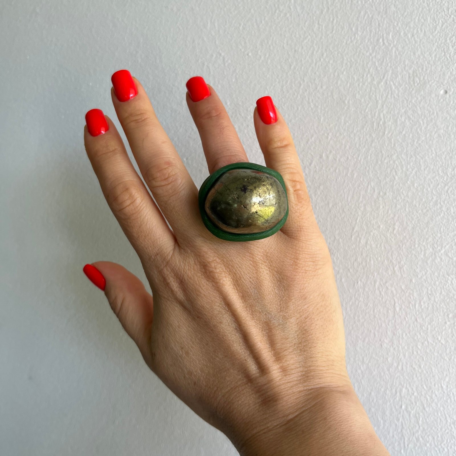 A sculptural and expressive ring where natural mineral beauty meets contemporary ceramic design. This one-of-a-kind Pyrite ring named Pyrite Vector features a polished stone with soft, organic curves set into a deep dark-green ceramic band that echoes the shape of the gemstone.
